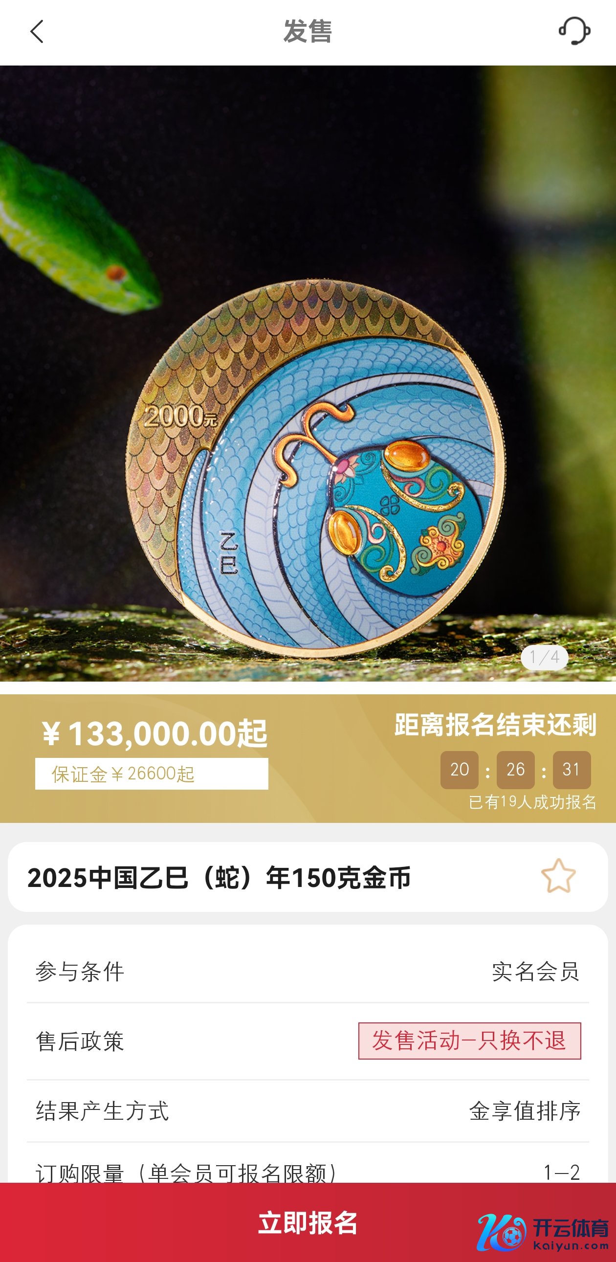 11月18日,中国东谈主民银行刊行了2025中国乙巳(蛇)年贵金属操心币一套,共有12枚。记者发现,金银币面值并非本体销售价钱。以150克圆形金质操心币为例,面额2000元,售价为13.3万元,需要交纳保证金2.66 万元,页面表示已有19东谈主报名,而况“只换不退”。