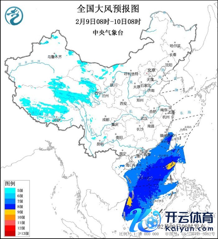 展望,2月9日08时至10日08时,内蒙古西部、新疆北部和东部、西藏中部、青海南部和东部、甘肃西部、海南岛、台湾岛等地的部分地区有5~6级、阵风7~8级大风;台湾海峡、巴士海峡、南海大部海域将有7~8级、阵风9级的东北风,其中巴士海峡、南海东北部、中东部和西南部的部分海域风力可达9级、阵风10级。