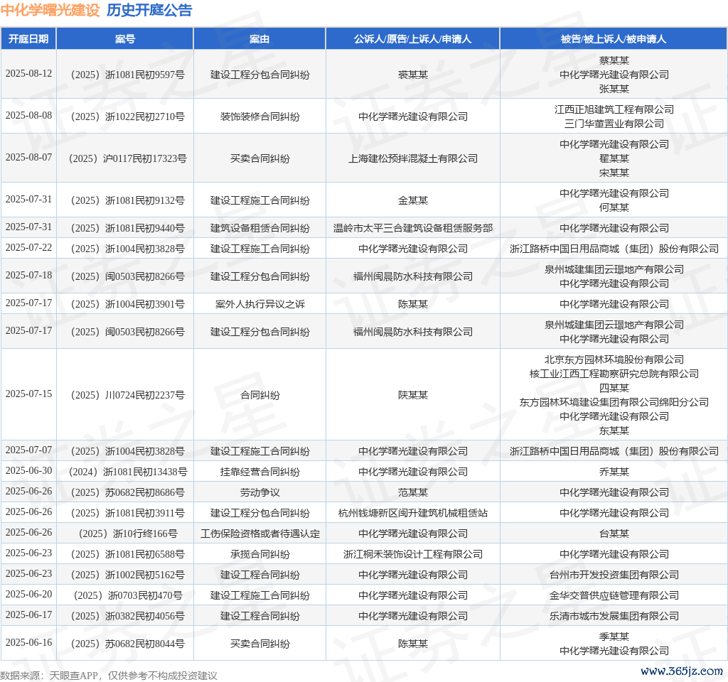 案号:(2025)浙1081民初9597号审理法院:温岭市东谈主民法院案由:开垦工程分包左券纠纷当事东谈主信息: 原告/上诉东谈主:裘某某 被告/被上诉东谈主:蔡某某、中化学朝阳开垦有限公司、张某某开庭日历:2025年8月12日凭据统计,近一年内以中化学朝阳开垦有限公司为当事东谈主的历史开庭公告有103则,其中案由为“开垦工程施工左券纠纷”的公告以23则居首,其次为“交易左券纠纷”有19则,“开垦工程分包左券纠纷”有18则。历史开庭公告(前20条)如下:
